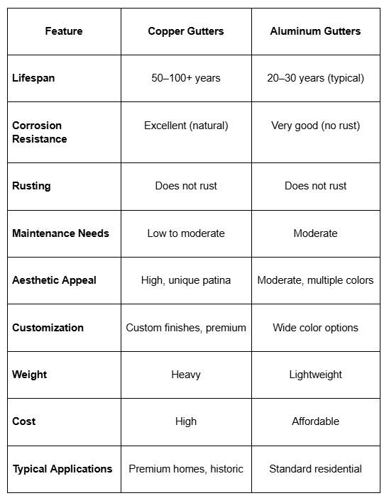 In this comprehensive guide — tailored to homeowners who care about value, performance, durability, and aesthetics — we’ll break down everything you need to know about copper and aluminum gutters, including material differences, real-world performance, cost considerations, long-term value, and the situations where each makes sense.